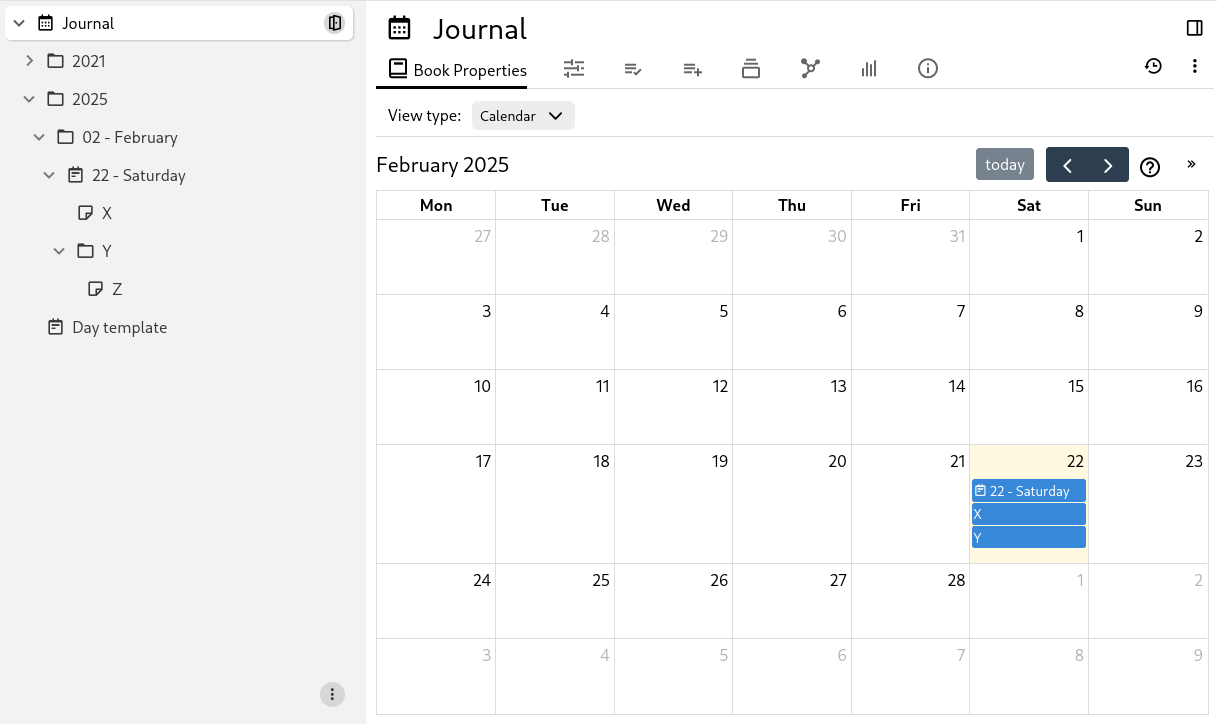 It is possible to integrate the calendar view into the Journal with day notes. In order to do so change the note type of the Journal note (calendar root) to Collection and then select the Calendar View.