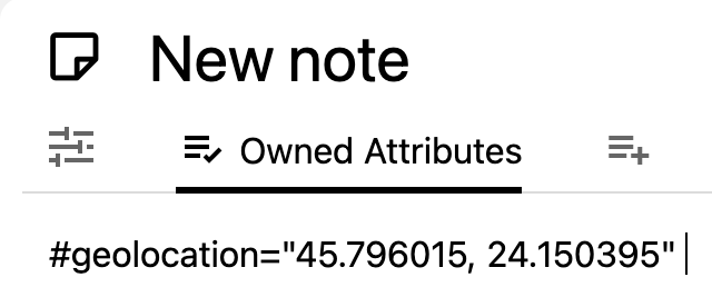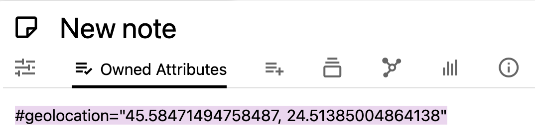 | And then go to Owned Attributes and type `#geolocation="`, then paste from the clipboard as-is and then add the ending `"` character. Press Enter to confirm and the map should now be updated to contain the new note. | ### Adding from OpenStreetMap Similarly to the Google Maps approach: | | | | | --- | --- | --- | | 1 | | Go to any location on openstreetmap.org and right click to bring up the context menu. Select the “Show address” item. | | 2 | | The address will be visible in the top-left of the screen, in the place of the search bar.