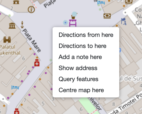 Simply click the point on the map where to place the marker, or the Escape key to cancel. | | 3 | | Enter the name of the marker/note to be created. | | 4 | | Once confirmed, the marker will show up on the map and it will also be displayed as a child note of the map. | ### Adding a new note using the contextual menu 1. Right click anywhere on the map, where to place the newly created marker (and corresponding note). 2. Select _Add a marker at this location_. 3. Enter the name of the neNote Treewly created note. 4. The map should be updated with the new marker. ### Adding an existing note on note from the note tree 1. Select the desired note in the Note Tree. 2. Hold the mouse on the note and drag it to the map to the desired location. 3. The map should be updated with the new marker. This works for: * Notes that are not part of the geo map, case in which a [clone](../Basic%20Concepts%20and%20Features/Notes/Cloning%20Notes.md) will be created. * Notes that are a child of the geo map but not yet positioned on the map. * Notes that are a child of the geo map and also positioned, case in which the marker will be relocated to the new position. > [!NOTE] > Dragging existing notes only works if the map is in editing mode. See the _Read-only_ section for more information. ## How the location of the markers is stored The location of a marker is stored in the `#geolocation` attribute of the child notes: This value can be added manually if needed. The value of the attribute is made up of the latitude and longitude separated by a comma. ## Repositioning markers It's possible to reposition existing markers by simply drag and dropping them to the new destination. As soon as the mouse is released, the new position is saved. If moved by mistake, there is currently no way to undo the change. If the mouse was not yet released, it's possible to force a refresh of the page (Ctrl+R ) to cancel it. ## Interaction with the markers * Hovering over a marker will display a Note Tooltip with the content of the note it belongs to. * Clicking on the note title in the tooltip will navigate to the note in the current view. * Middle-clicking the marker will open the note in a new tab. * Right-clicking the marker will open a contextual menu (as described below). * If the map is in read-only mode, clicking on a marker will open a Quick edit popup for the corresponding note. ## Contextual menu It's possible to press the right mouse button to display a contextual menu. 1. If right-clicking an empty section of the map (not on a marker), it allows to: 1. Displays the latitude and longitude. Clicking this option will copy them to the clipboard. 2. Open the location using an external application (if the operating system supports it). 3. Adding a new marker at that location. 2. If right-clicking on a marker, it allows to: 1. Displays the latitude and longitude. Clicking this option will copy them to the clipboard. 2. Open the location using an external application (if the operating system supports it). 3. Open the note in a new tab, split or window. 4. Remove the marker from the map, which will remove the `#geolocation` attribute of the note. To add it back again, the coordinates have to be manually added back in. ## Icon and color of the markers