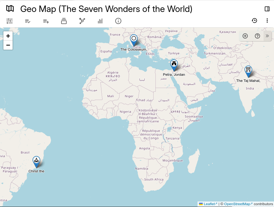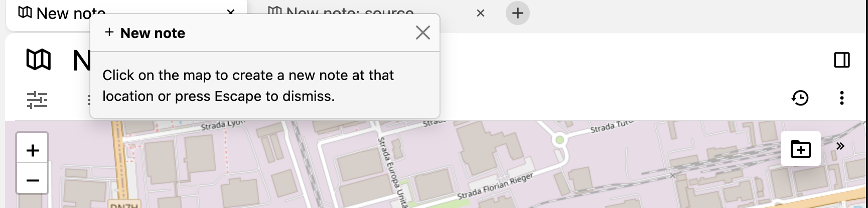 This note type displays the children notes on a geographical map, based on an attribute. It is also possible to add new notes at a specific location using the built-in interface. ## Creating a new geo map Right click on an existing note in the Note Tree and select _Geo Map_. By default the map will be empty and will show the entire world. ## Repositioning the map * Click and drag the map in order to move across the map. * Use the mouse wheel, two-finger gesture on a touchpad or the +/- buttons on the top-left to adjust the zoom. The position on the map and the zoom are saved inside the map note and restored when visiting again the note. ## Adding a marker using the map ### Adding a new note using the plus button | | | | | --- | --- | --- | | 1 | To create a marker, first navigate to the desired point on the map. Then press the ![](9_Geo%20Map_image.png) button in the [Floating buttons](../Basic%20Concepts%20and%20Features/UI%20Elements/Floating%20buttons.md) (top-right) area.