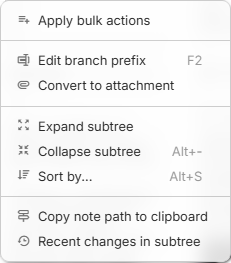 The _note tree menu_ can be accessed by right-clicking in the Note Tree. ## Interaction The contextual menu can operate: * On a single note, by right clicking it in the note tree. * On multiple notes, by selecting them first. See Multiple selection on how to do so. * When right clicking, do note that usually the note being right clicked is also included in the affected notes, regardless of whether it was selected or not. ## Available options > [!NOTE] > When multiple notes are selected, only a subset of notes will be active. The ones that do support multiple notes will mention this in the list below. * **Open in a new tab** * Will open a single note in a new [tab](../Tabs.md). * **Open in a new split** * Will open a split to the right with the given note within the current tab. * **Hoist note** * Will focus the note tree on this note. See Note Hoisting for more information. * **Insert note after** * Allows easy creation of a note with a specified [note type](../../../Note%20Types.md). * Templates will also be present (if any) at the end of the list. * The note will be added on the same level of hierarchy as the note selected. * **Insert child note** * Same as _Insert note after_, but the note will be created as a child of the selected note. * **Protect subtree** * Will mark this note and all of its descendents as protected. See Protected Notes for more information. * **Unprotect subtree** * Will unprotect this note and all of its descendents. * **Cut** * Will place the given notes in clipboard. * Use one of the two paste functions (or the keyboard shortcuts) to move them to the desired location. * **Copy / clone** * Will place the given notes in clipboard. * Use one of the two paste functions (or the keyboard shortcuts) to copy them to the desired location. * Note that the copy function here works according to the Cloning Notes functionality (i.e. the note itself will be present in two locations at once, and editing it in one place will edit it everywhere). * To simply create a duplicate note that can be modified independently, look for _Duplicate subtree_. * **Paste into** * If there are any notes in clipboard, they will be pasted as child notes to the right-clicked one. * **Paste after** * If there are any notes in clipboard, they will be pasted underneath the right-clicked one. * **Move to…** * Will display a modal to specify where to move the desired notes. * **Clone to…** * Will display a modal to specify where to [clone](../../Notes/Cloning%20Notes.md) the desired notes. * **Duplicate** * Creates a copy of the note and its descendants. * This process is different from Cloning Notes since the duplicated note can be edited independently from the original. * An alternative to this, if done regularly, would be Templates. * **Archive/Unarchive** * Marks a note as [archived](../../Notes/Archived%20Notes.md). * If the note is already archived, it will be unarchived instead. * Multiple notes can be selected as well. However, all the selected notes must be in the same state (archived or not), otherwise the option will be disabled. * **Delete** * Will delete the given notes, asking for confirmation first. * In the dialog, the following options can be configured: * _Delete also all clones_ to ensure that the note will be deleted everywhere if it has been placed into multiple locations (see Cloning Notes). * _Erase notes permanently_ will ensure that the note cannot be recovered from Recent Changes. * **Import into note** * Opens the [import](../../Import%20%26%20Export.md) dialog and places the imported notes as child notes of the selected one. * **Export** * Opens the [export](../../Import%20%26%20Export.md) dialog for the selected notes. * **Search in subtree** * Opens a full Search with it preconfigured to only look into this note and its descendants (the _Ancestor_ field). ## Advanced options
