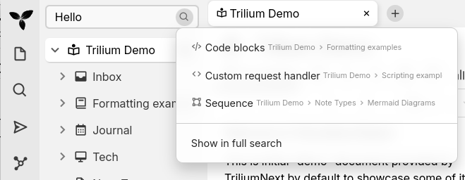 The _Quick search_ function does a full-text search (that is, it searches through the content of notes and not just the title of a note) and displays the result in an easy-to-access manner.