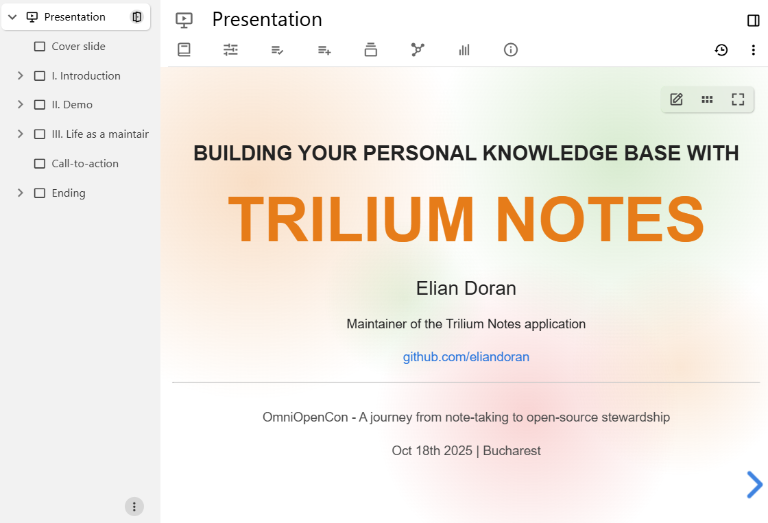 The Presentation view allows the creation of slideshows directly from within Trilium.