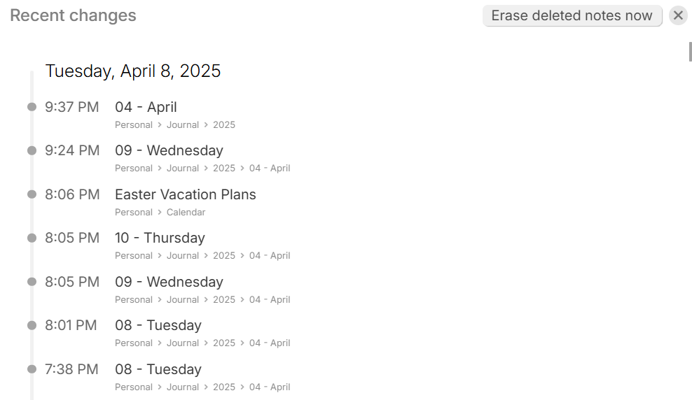 * Deleted notes will also be listed here, at their time of deletion. Press the _Undelete_ link next to them in order to recover them.