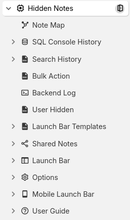 | SQL Console History | When SQL queries or commands are executed in the SQL Console, they are stored here, grouped by month. Only the query is stored and not the results. This section can be accessed without going to the hidden tree by simply going to the Global menu and selecting Advanced → Open SQL Console History. Notes can be added as children of this tree, but it's generally not recommended to do so to not interfere with the normal history process. |