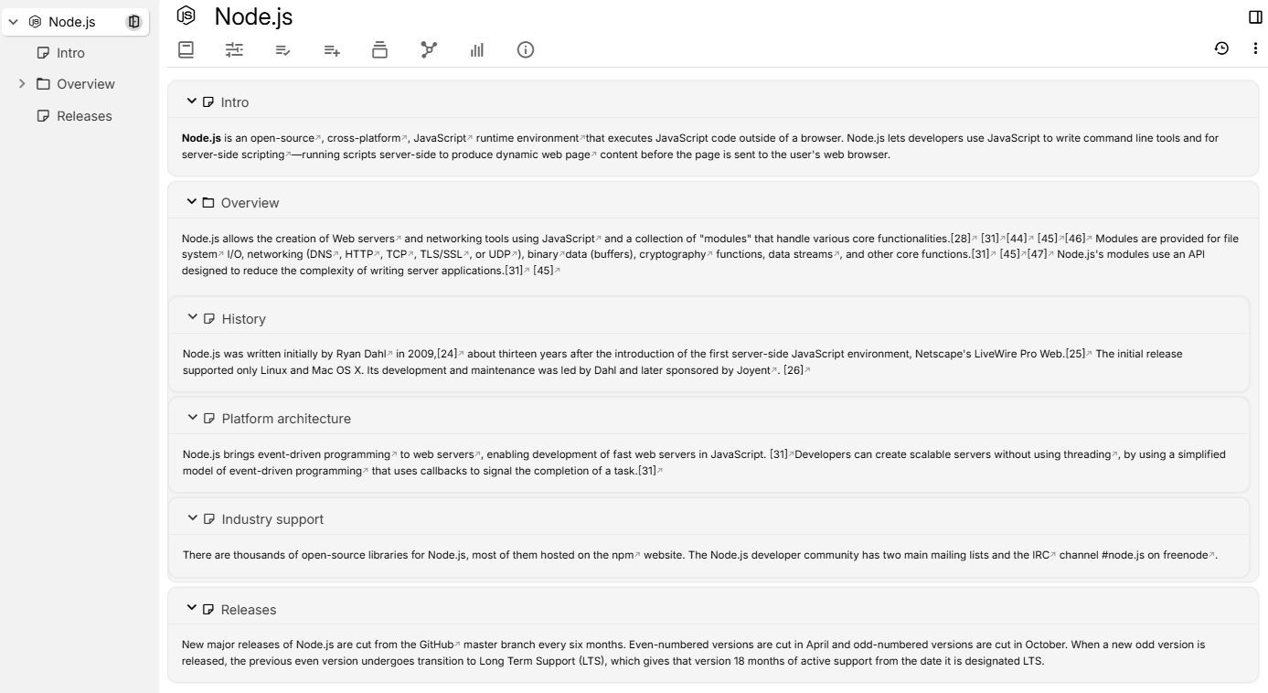 In the example above, the "Node.js" note on the left panel contains several child notes. The right panel displays the content of these child notes as a single continuous document.