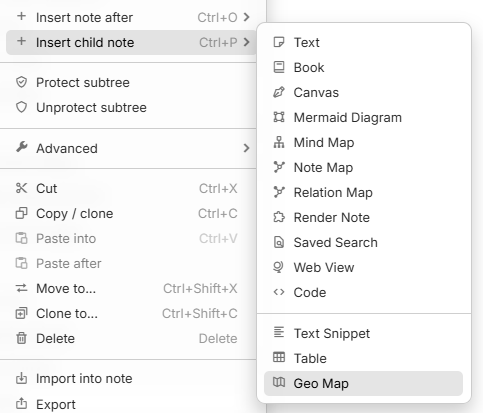 Right click on any note on the note tree and select Insert child noteGeo Map (beta).