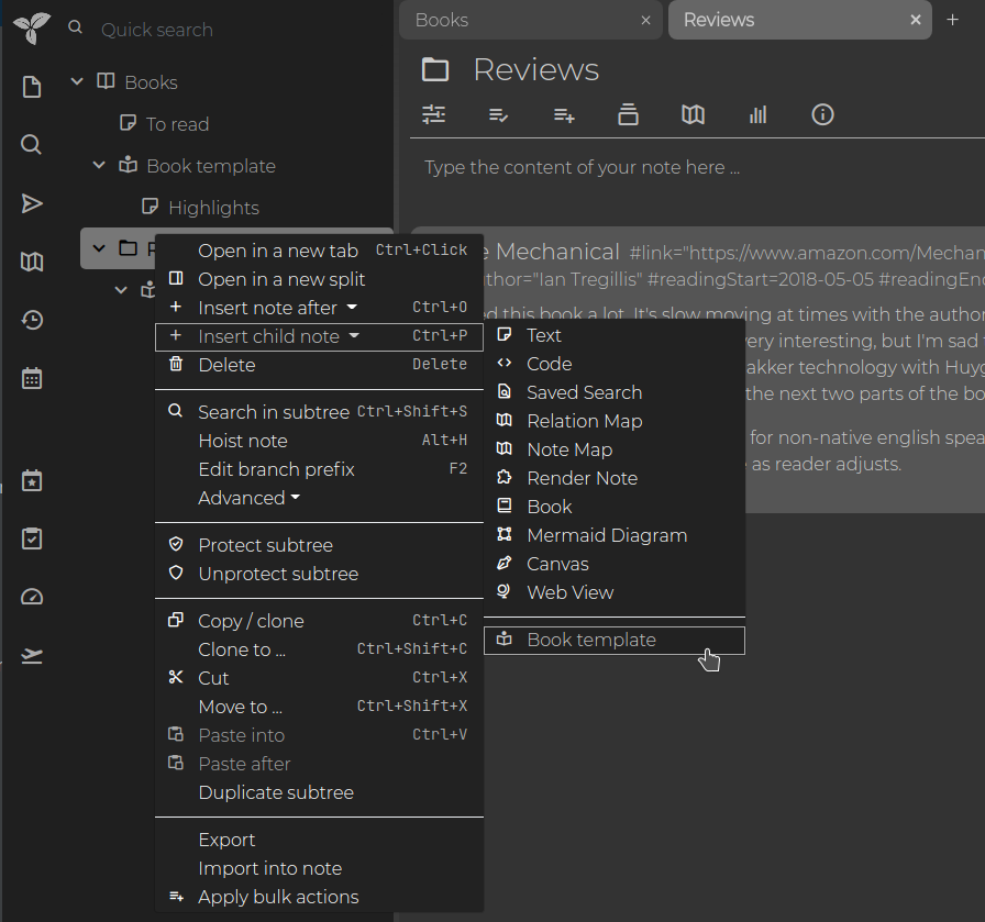 A typical example would be a "Book" template note, which might include: