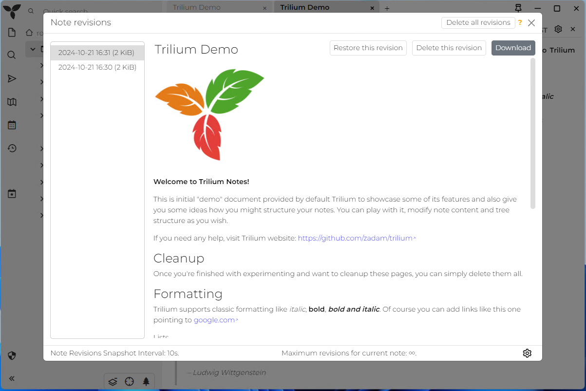 Trilium supports seamless versioning of notes by storing snapshots ("revisions") of notes at regular intervals.