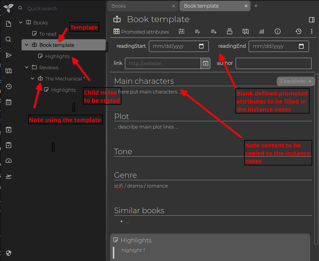A template in Trilium serves as a predefined structure for other notes, referred to as instance notes. Assigning a template to a note brings three main effects: