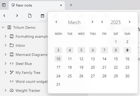 {isoDate}results in an ISO 8061 formatted date (e.g. "2025-03-09" for March 9, 2025){dateNumber}results in a number like9for the 9th day of the month,11for the 11th day of the month{dateNumberPadded}results in a number like09for the 9th day of the month,11for the 11th day of the month{ordinal}is replaced with the ordinal date (e.g. 1st, 2nd, 3rd) etc.{weekDay}results in the full day name (e.g.Monday){weekDay3}is replaced with the first 3 letters of the day, e.g. Mon, Tue, etc.{weekDay2}is replaced with the first 2 letters of the day, e.g. Mo, Tu, etc.